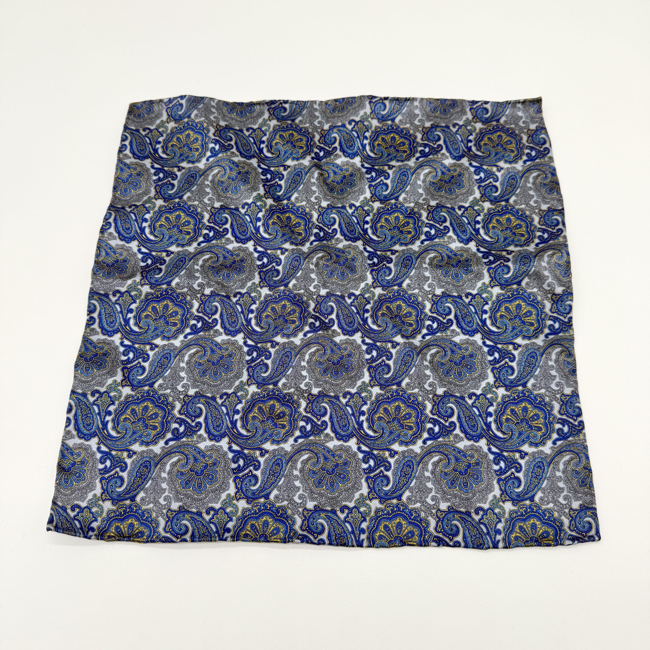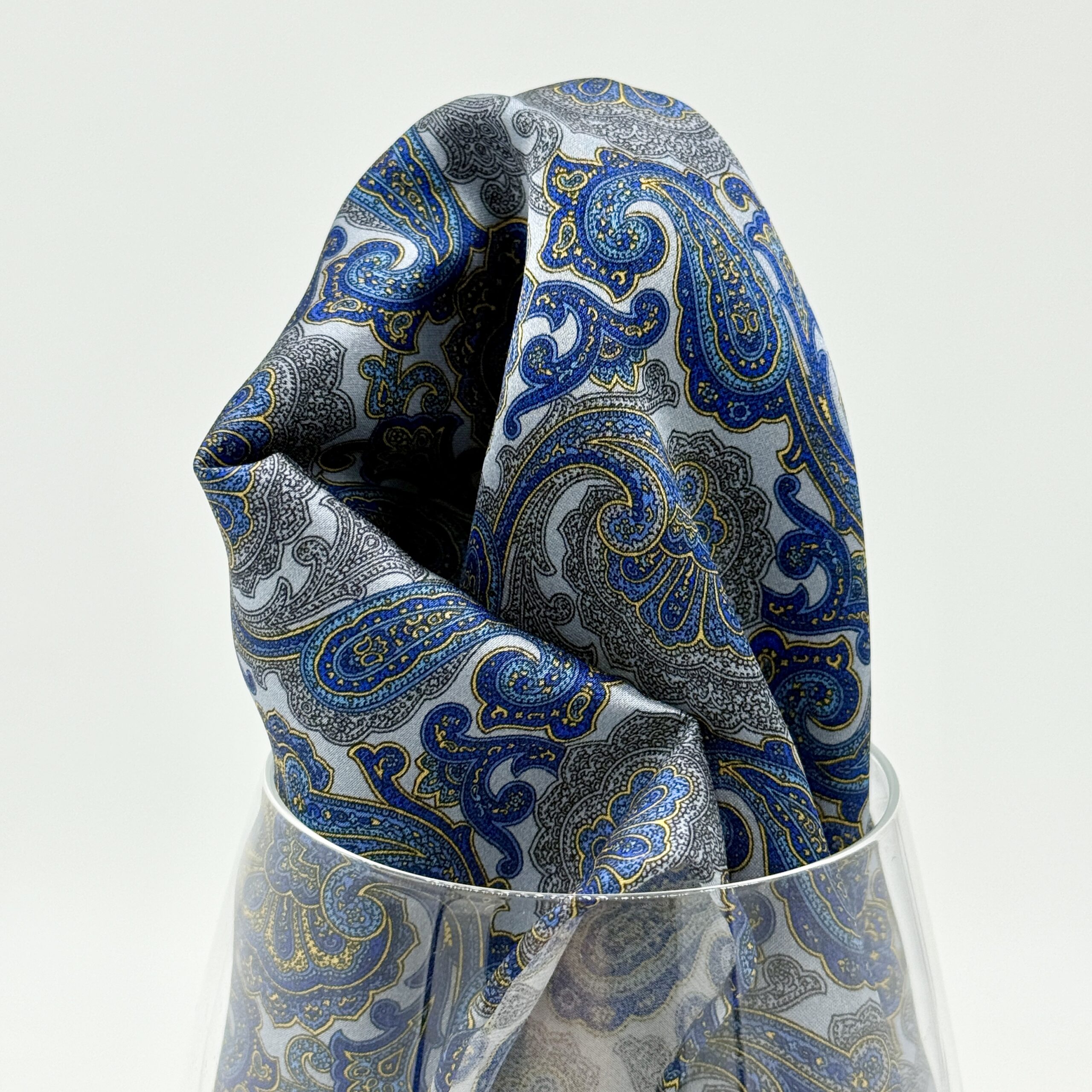 100% Hand Rolled Silk Pocket Square – Ready To Wear – Paisley – Silver – Hand Made In Italy