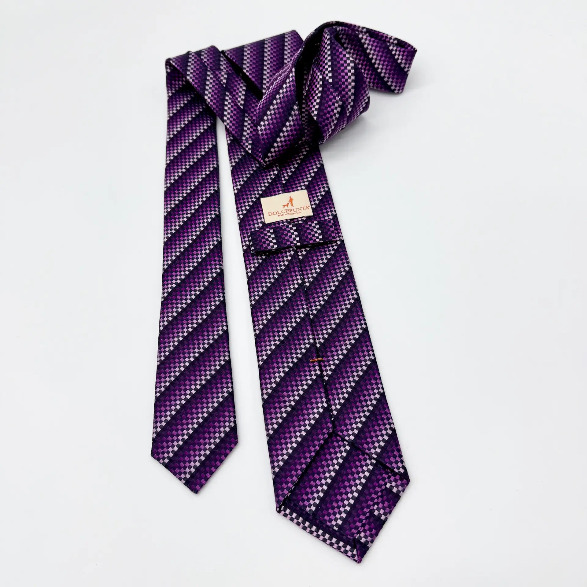 100% Silk Tie Ready To Wear – Woven Silk – Violet – Stripe Pattern – Hand Made In Italy